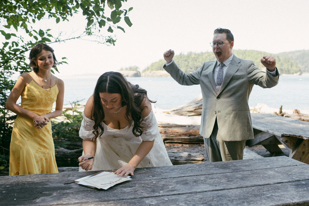 After their first look at Deception Pass, they snuck away with two friends to sign their license in a quiet corner of the park. They wanted a quieter space to handle the paperwork so that they didn’t take away from the celebratory time post-ceremony. Continuing with the theme of doing things their way, Alyse + Josh also approached the ceremony itself differently. Rather than having a wedding party, they walked down the aisle with their parents. It was simple, meaningful, and such a sweet reminder that you can shape your day however you want. There are no rules here. Choose what feels right, and let the rest go.